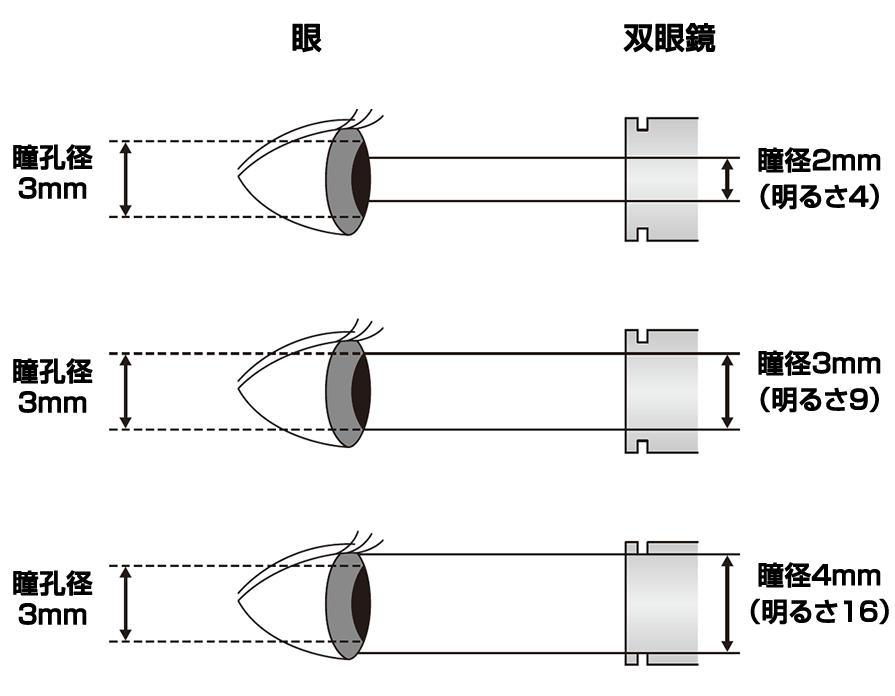 • 瞳孔が3mmのとき、ひとみ径2mm(明るさ4)の双眼鏡を使うと、ひとみ径のほうが1mm小さいため、暗く感じます。